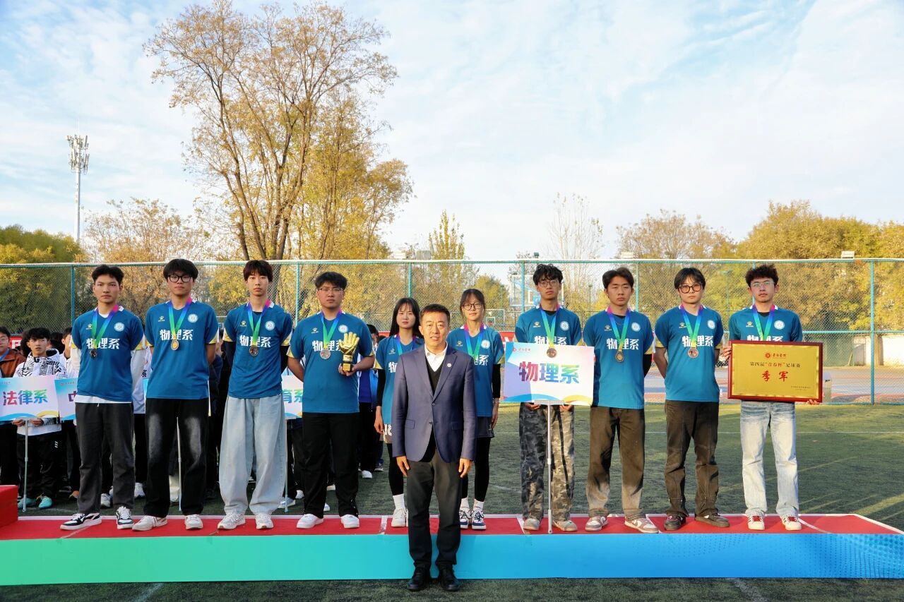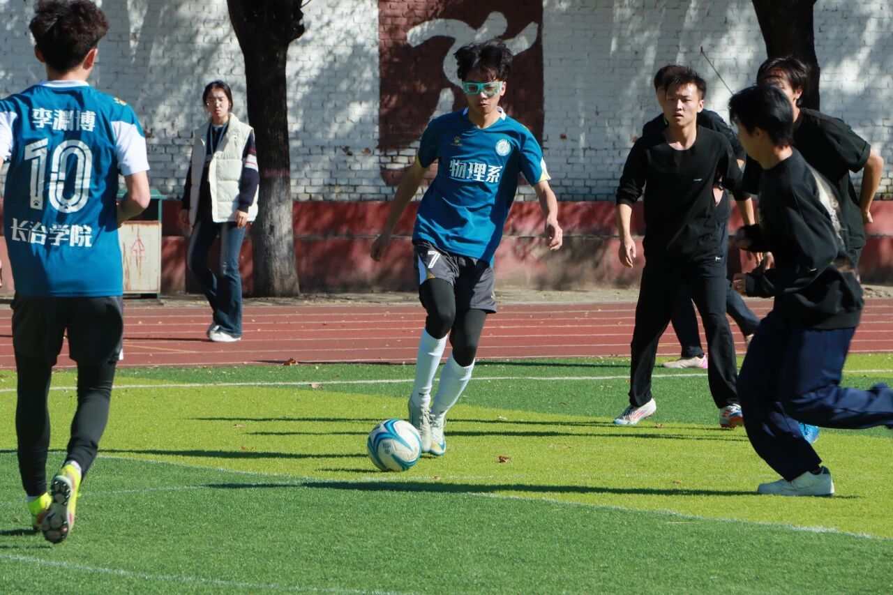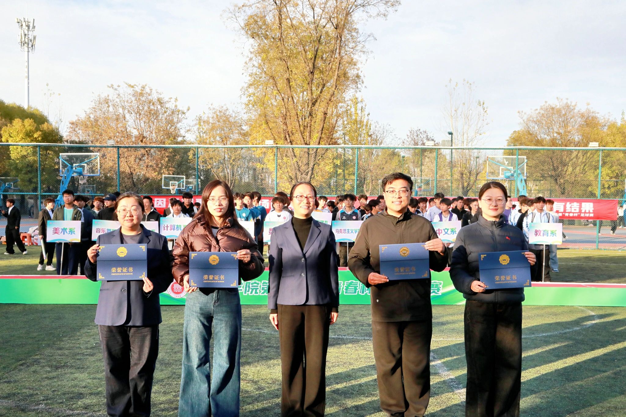 场上,球员们秉持“友谊第一,比赛第二”的体育精神,展现出精准传球、巧妙配合、顽强防守、果断射门等精彩表现。场下,各院系啦啦队为运动员呐喊助威,志愿者们在赛场各处提供后勤服务。现场师生热情互动,让绿茵场成为充满温情与力量的青春舞台。最终,经济与管理系摘得桂冠,数学系、物理系分获二、三名,赛事同时评选出了“优秀裁判员”“道德风尚奖”等单项奖与集体奖项。