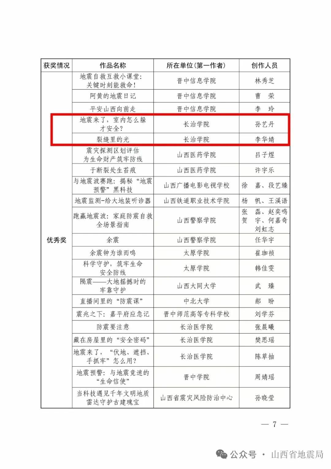 近日,由山西省地震局、山西省教育厅、共青团山西省委、山西省科学技术协会联合举办的2025年山西省防震减灾科普作品大赛评选结果揭晓。我校凭借多件优秀作品和扎实的组织工作,荣获"优秀组织奖"。同时,我校学子在多个类别中斩获奖项,充分展现了我校在科普创作与实践育人方面的突出成效。