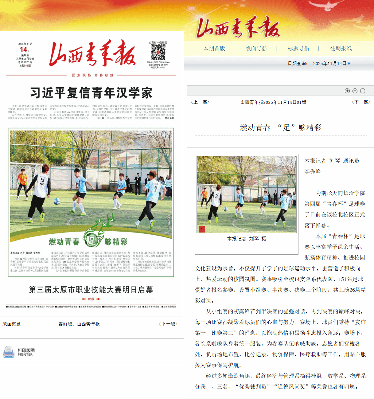 近日,我校第四届“青春杯”足球赛凭借精彩的竞技风貌与深厚的育人内涵,成功登上山西青年报头版。这一荣誉不仅是对我校足球运动发展的高度认可,更是校园体育文化建设结出的丰硕成果。