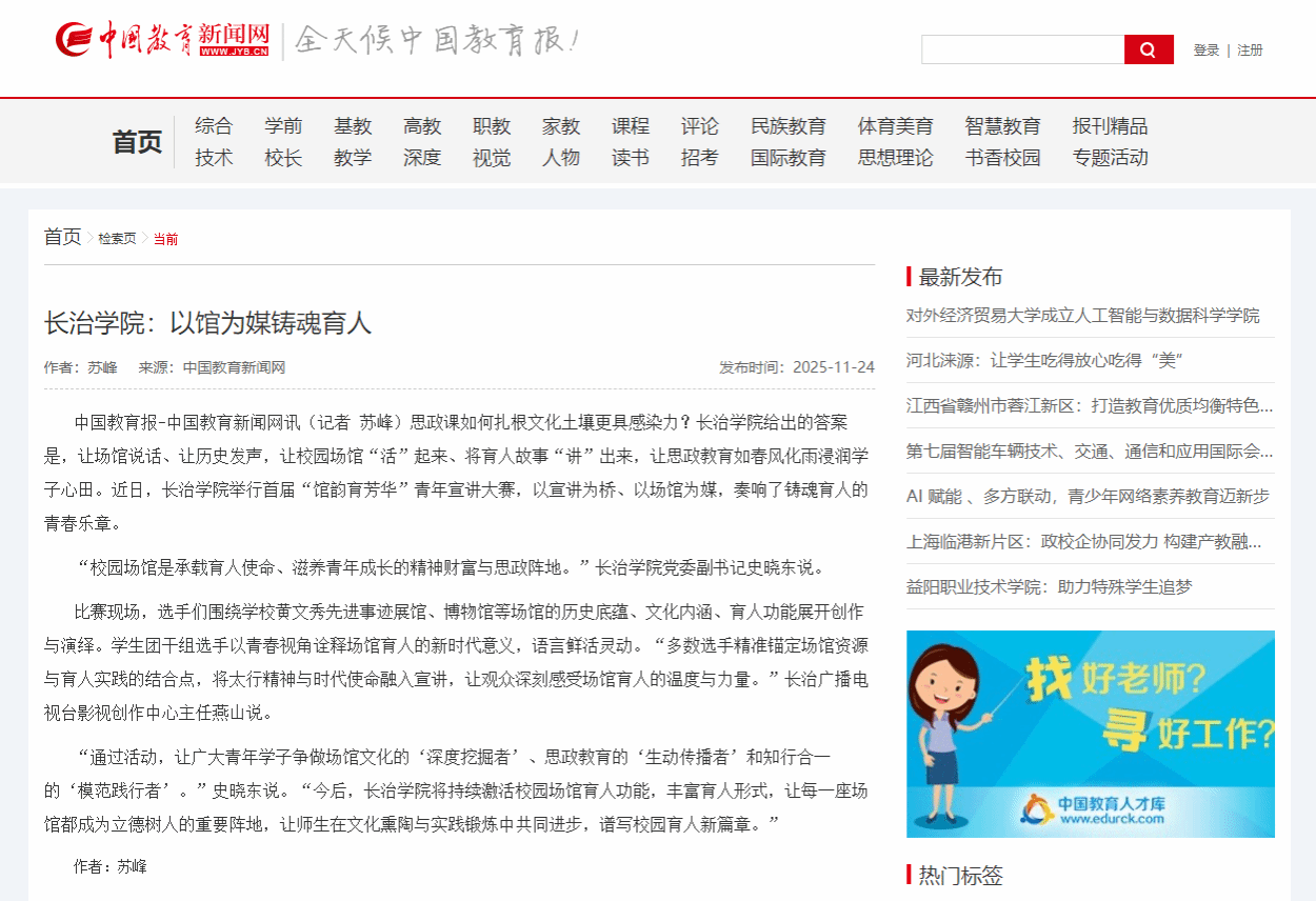 中国教育新闻网:长治学院: 以馆为媒铸魂育人 (2025年11月24日报道)