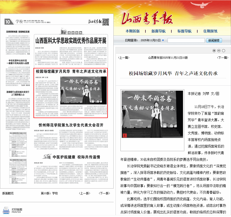 山西青年报:校园场馆藏岁月风华 青年之声述文化传承 (2025年11月21日报道)