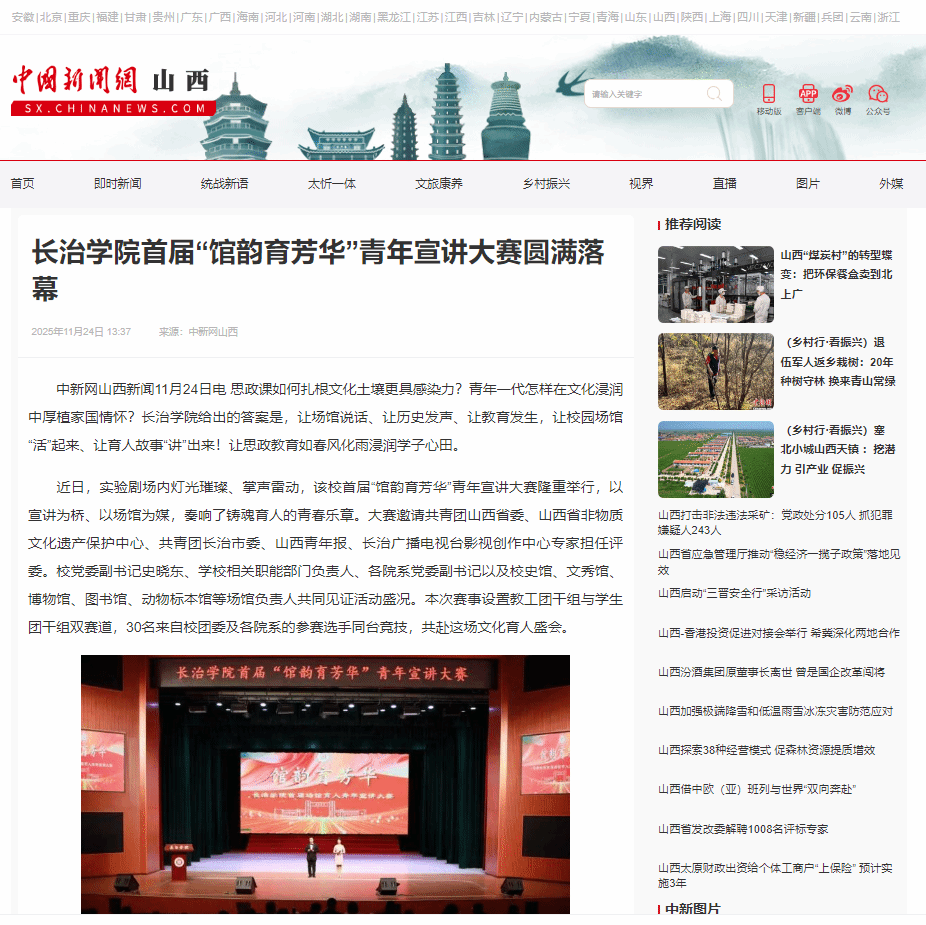 中国新闻网:长治学院首届"馆韵育芳华"青年宣讲大赛圆满落幕 (2025年11月24日报道)