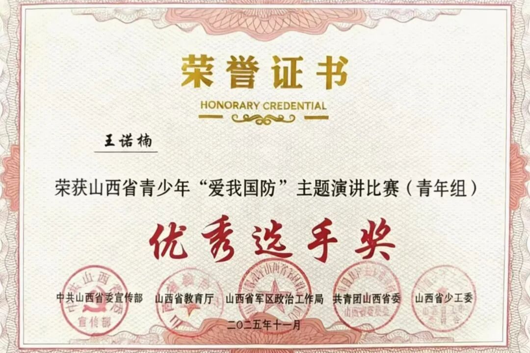 近日,山西省青少年“爱我国防”主题演讲比赛决赛在山西师范大学圆满落幕。我校经济与管理系财管2301班王诺楠同学以《以脊梁之名,筑山河永固》为题,凭借出色表现荣获山西省级决赛青年组“优秀选手奖”。