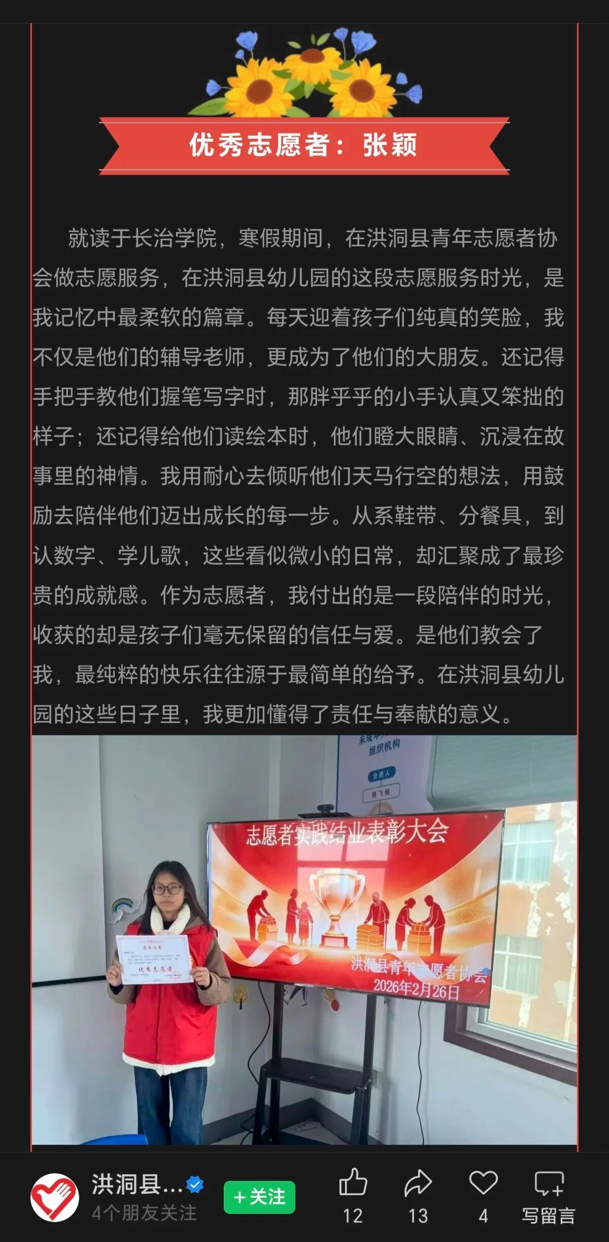 (物理系学子张颖的“关爱一老一少活动”被洪洞县青年志愿者协会报道)