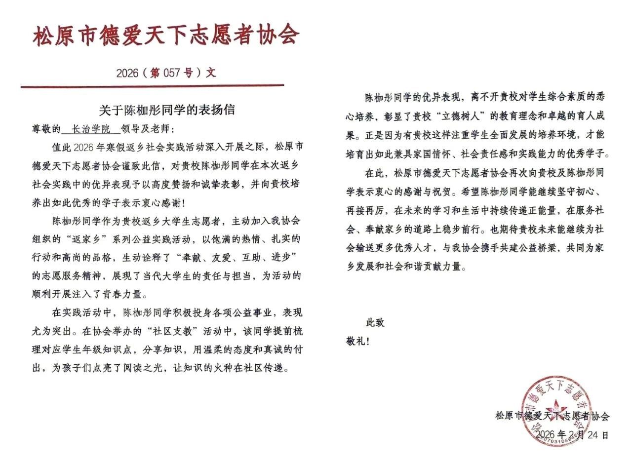 同学们立足数学专业特色,深入基层服务、教育帮扶、生态环保、安全知识宣传等实践场景,将数学逻辑思维、数据处理能力融入各项工作中。在基层服务中,精准完成数据统计、信息整理、台账梳理等工作;在教育帮扶中,开展数学课业辅导、思维训练,助力青少年提升数学学习能力;在生态环保与安全宣传中,协助开展数据调研、宣传策划、群众动员等工作。其中,数学 25 专升本 1 班陈伽彤在吉林省松原市德爱天下志愿者协会组织的“社区支教”活动中获得表彰,并收到表扬信;数学2501班李心如同学的社会实践情况亦被“文水融媒”抖音号报道。通过实践,学子们有效锻炼了数据处理、逻辑分析、组织协调、群众沟通等核心能力,深化了对国情、社情、民情的认识与理解,打破了书本知识与社会实际的壁垒,实现了专业知识与社会实践的有机结合、相互促进。