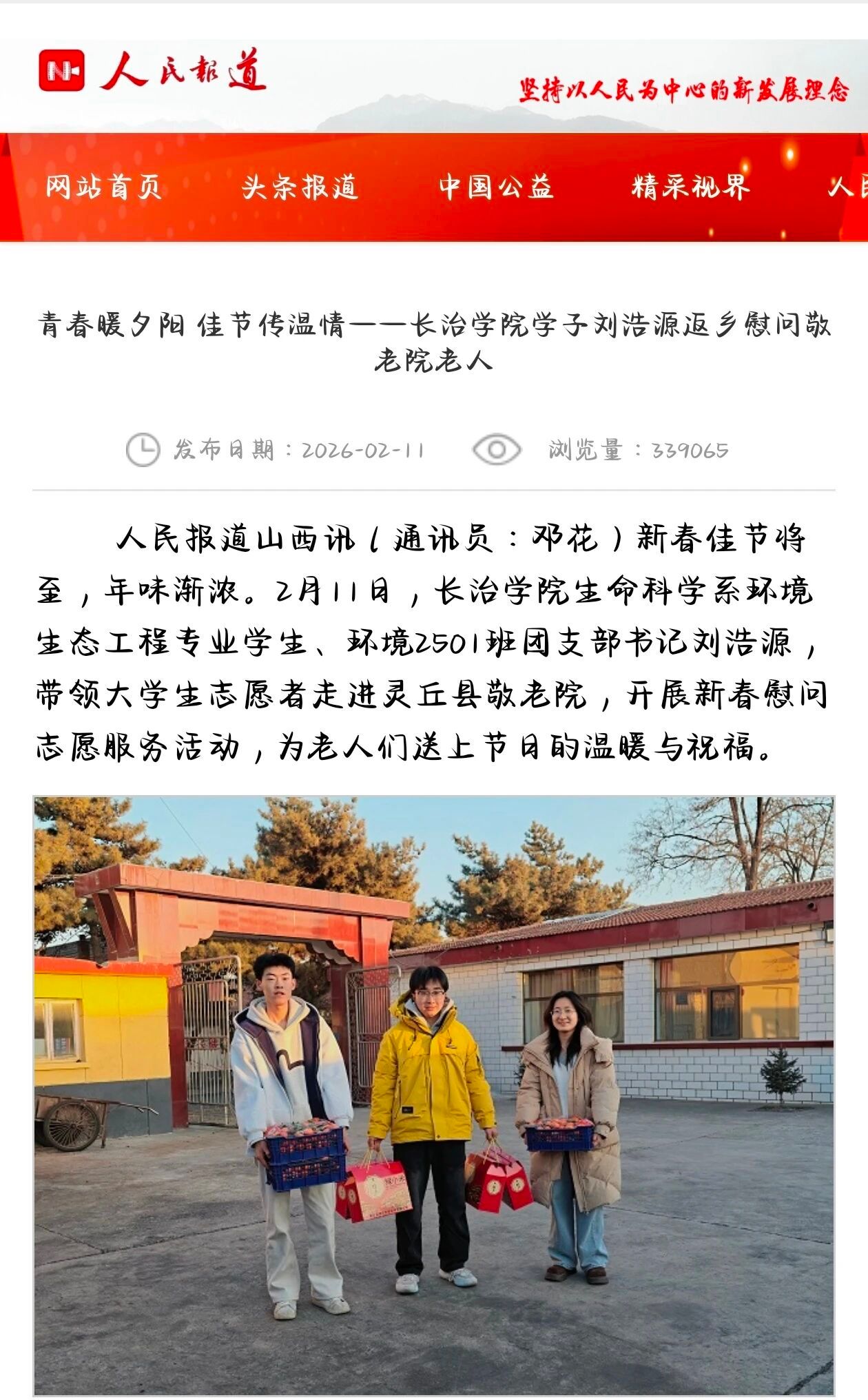 (《人民报道山西讯》对生命科学系学子刘浩源敬老院慰问志愿活动进行报道)