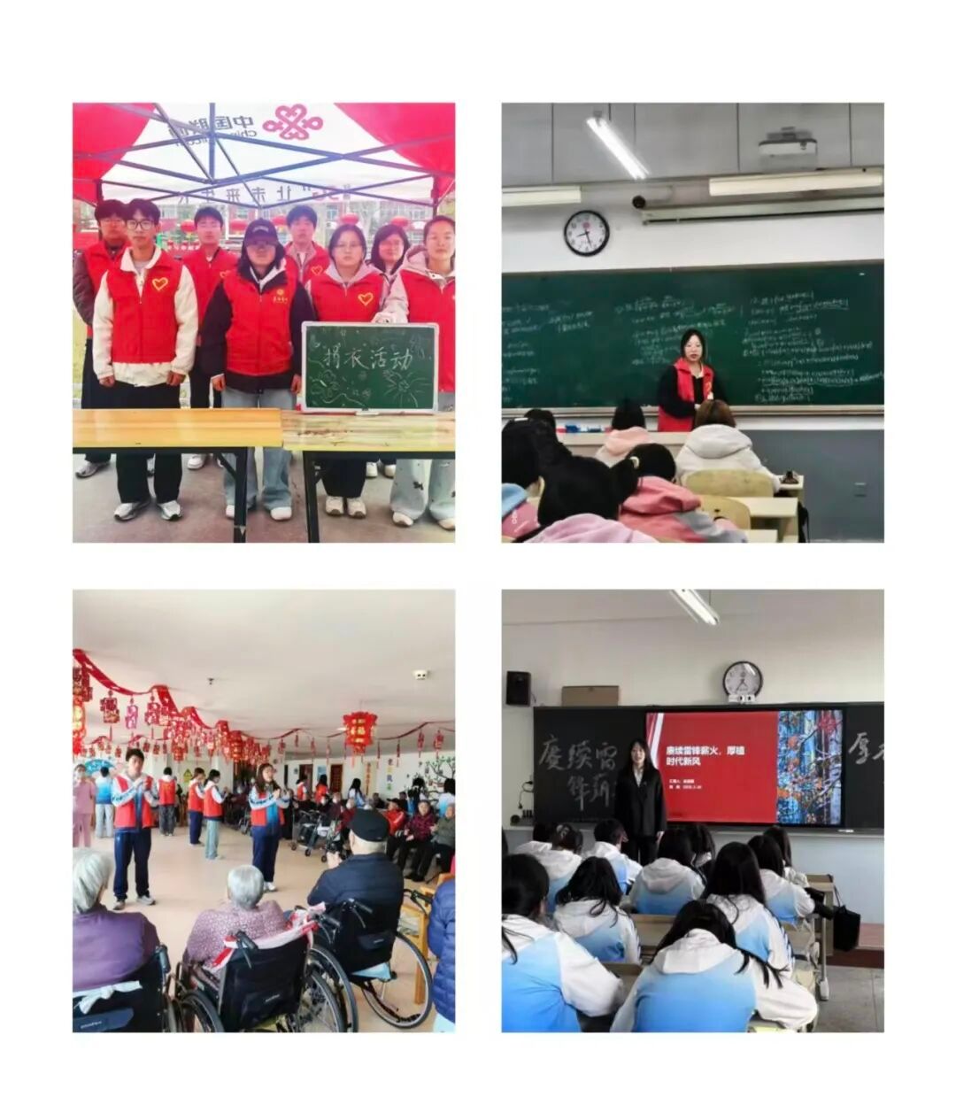 思想引领方面,各团支部开展“赓续雷锋薪火,厚植时代新风”主题团日活动,950余名学生齐唱团歌,共同学习雷锋精神的核心内涵与时代价值,强化了奉献意识与服务意识。社会公益方面,数学系联合校青协开展“‘衣’路相伴,情暖校园”捐衣活动,同学们踊跃捐赠闲置衣物,志愿者有序完成登记、分类、打包,衣物经分拣清洗后送往山区孩子与户外工作者手中;组织志愿者赴长治市养老院开展志愿服务,为老人带来文艺表演、拍手操与互动小游戏,闲话家常倾听过往故事,用陪伴消解老人孤单;组织20余名学子赴长治市特殊教育学校开展板报绘制志愿活动,将励志标语与童趣卡通融入板报设计,完成一幅幅色彩绚丽、主题鲜明的板报,为特教校园增添温暖。