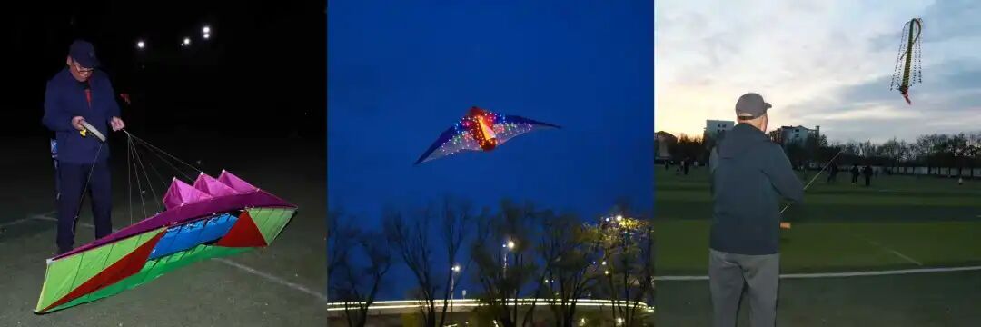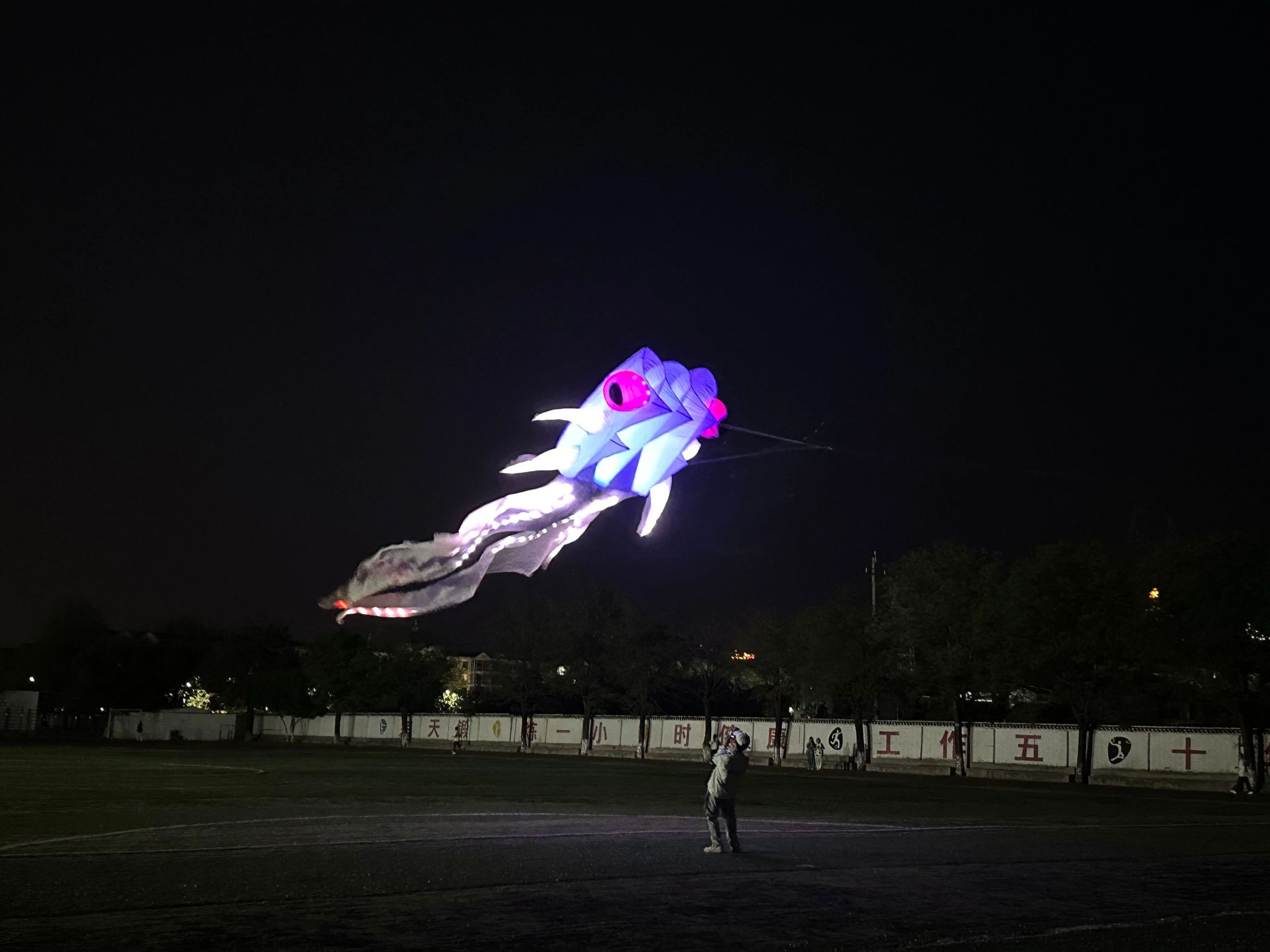 4月20日和23日傍晚,学校还特别安排了运动风筝和夜间风筝展示活动。运动风筝表演中,风筝在精准操控下完成盘旋升腾、俯冲疾行,展现出极佳的操控技巧与视觉冲击力;夜间风筝则缀以璀璨LED灯带,在夜幕中化作点点流光,宛若星河倾落,为师生带来了别样的视觉盛宴,展现了风筝运动的多元魅力。