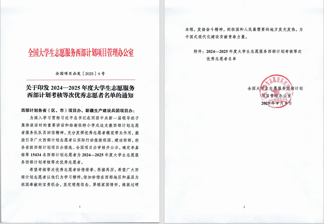 近日,全国大学生志愿服务西部计划项目管理办公室印发了《关于印发2024—2025年度大学生志愿服务西部计划考核等次优秀志愿者名单的通知》,我校陈俊宇、郭泽翔、孙嘉文王沛源、白瑞帆、张秀明、赵斌、武羽茜、李鹏、左旭龙、宫艳、李雅欣、任家骅、赵齐娇、郭琦、吴涛、惠京飞、刘雅楠、张瑜、马普20名西部计划志愿者在2024-2025年度大学生志愿服务西部计划志愿者考核中获评优秀等次。这份荣誉既是对他们个人服务成效的高度认可,更是学校践行“立德树人”根本任务、培育新时代青年担当精神的生动体现。