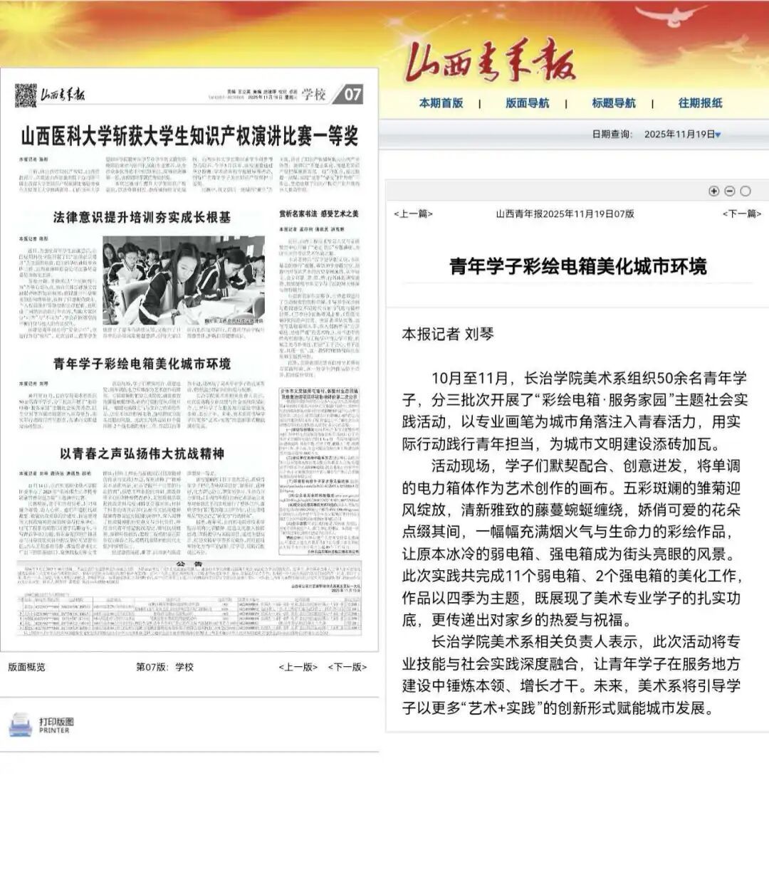 近期,我校美术系“彩绘电箱·服务家园”主题实践,接连获《长治新闻》《山西青年报》关注报道,用艺术为城市“美颜”的青春行动收获多方点赞。