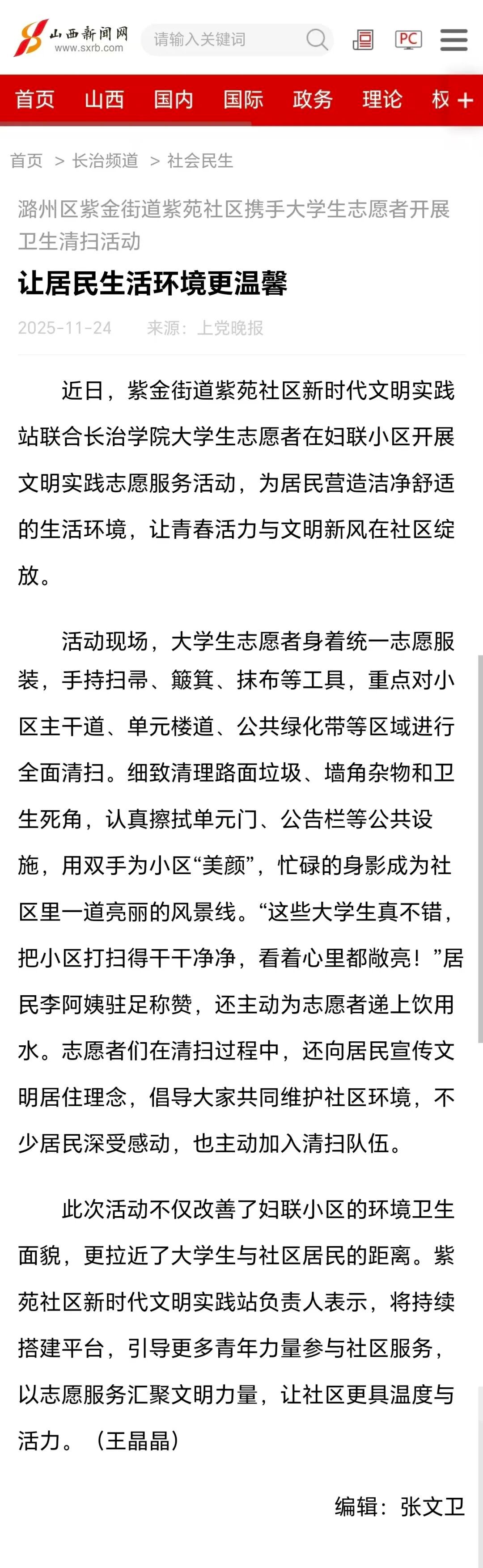 11月24日,《上党晚报》报道了我校志愿者联合紫苑社区新时代文明实践站开展的文明实践志愿服务活动,活动通过卫生清扫、宣传文明居住理念,助力改善社区卫生环境、汇聚文明力量,用青春力量为社区增添温度与活力。