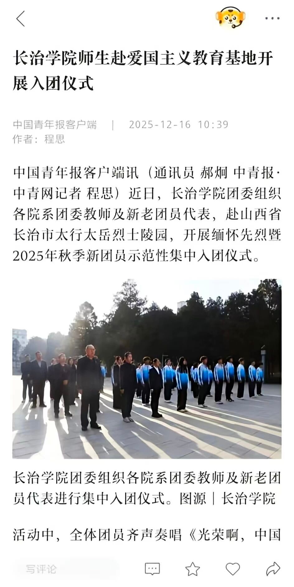 近日,《中国青年报》报道我校团委赴太行太岳烈士陵园开展缅怀先烈暨2025年秋季新团员示范性集中入团仪式,展现了我校在思想政治引领和实践创新方面的扎实成效。