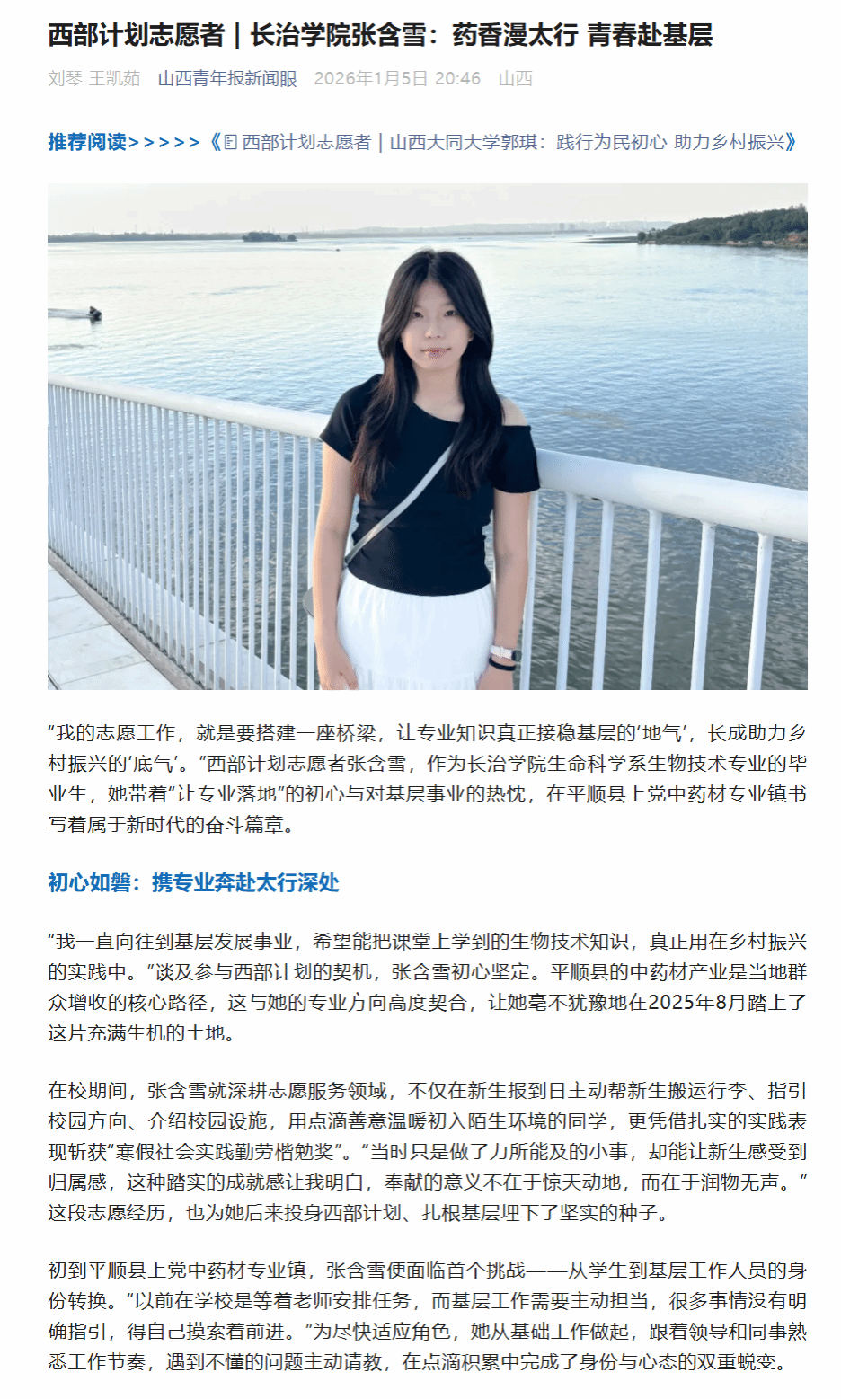 2026年1月5日《山西青年报新闻眼》对我校张含雪“药香漫太行 青春赴基层”进行了报道,现将全文转载如下: