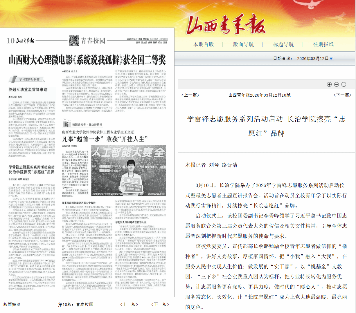 2026年3月12日《山西青年报》对我校“学雷锋志愿服务系列活动启动 长治学院擦亮‘志愿红’品牌”进行了报道,现将全文转载如下: