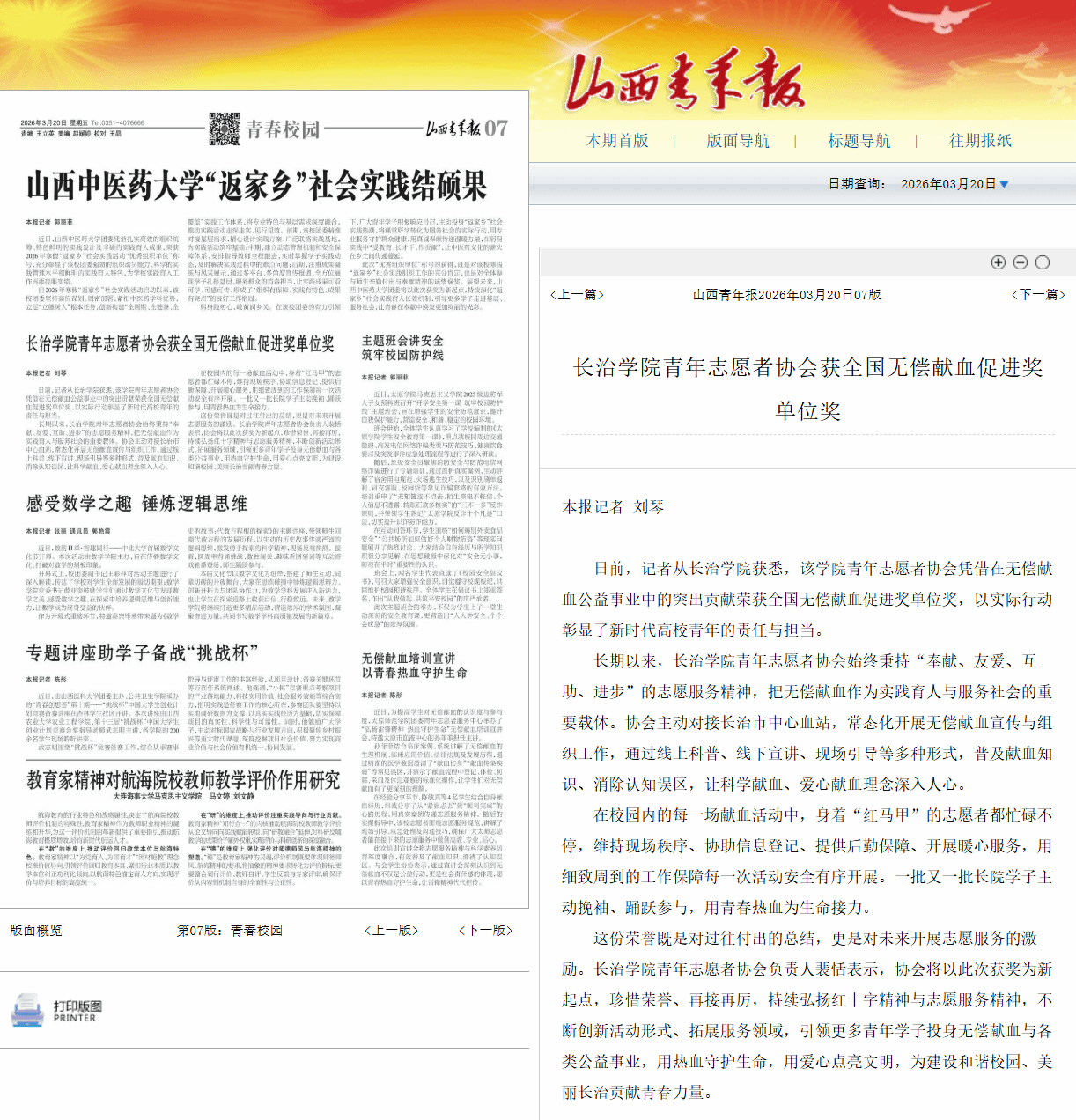 2026年3月20日《山西青年报》对我校青年志愿者协会获全国无偿献血促进奖单位奖”进行了报道,现将全文转载如下: