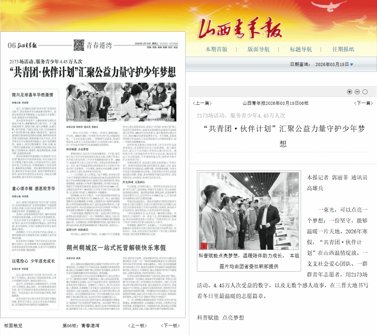 2026年3月18日《山西青年报》对我校“共青团·伙伴计划”汇聚公益力量守护少年梦想进行了报道,现将全文转载如下: