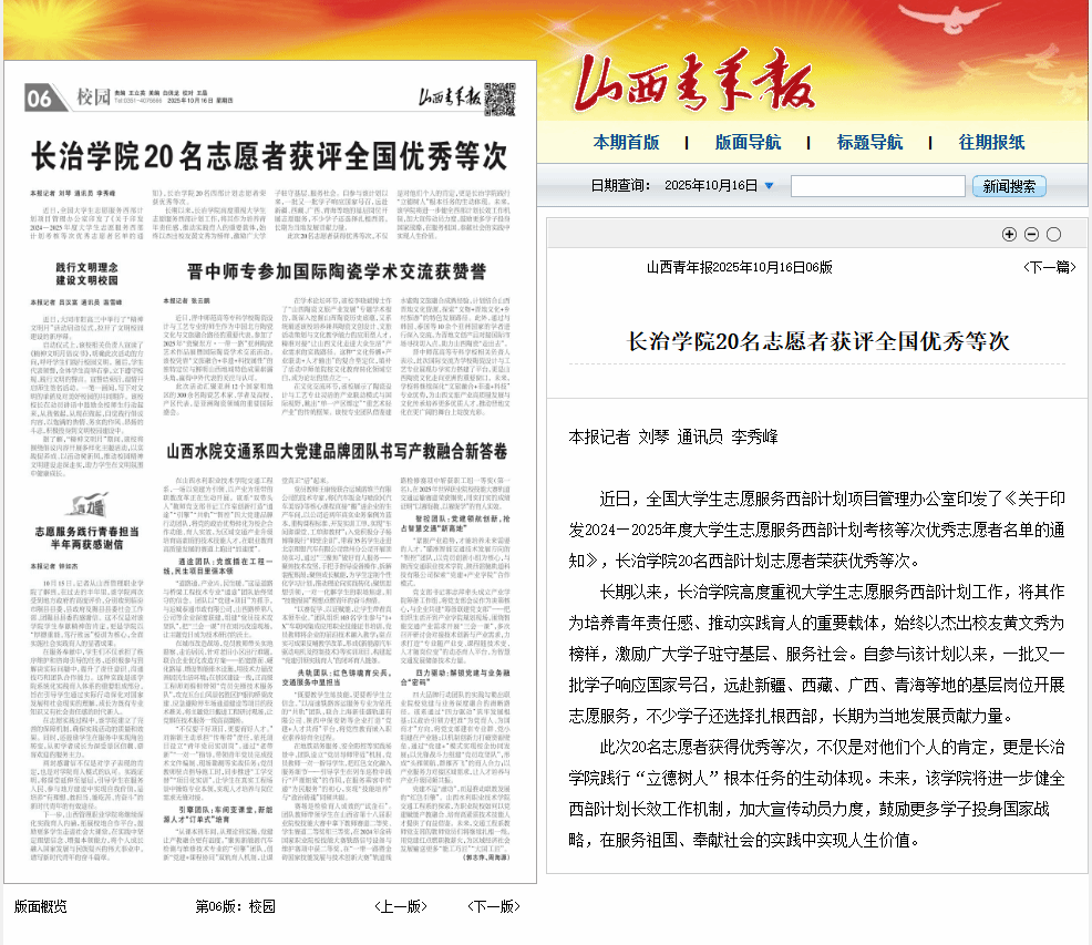 10月16日,《山西青年报》06版刊登了题为“长治学院20名志愿者获评全国优秀等次”的文章,报道我校20名西部计划志愿者在2024-2025年度大学生志愿服务西部计划志愿者考核中获评优秀等次。此次20名志愿者获得优秀等次,不仅是对他们个人的肯定,更是长治学院践行“立德树人”根本任务的生动体现。未来,学校将进一步健全西部计划长效工作机制,加大宣传动员力度,鼓励更多学子投身国家战略,在服务祖国、奉献社会的实践中实现人生价值。